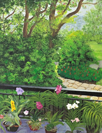 Art pieces include the poignant Harana, an acrylic-on-canvas of two flowers seemingly locked in a gaze; La Ventana, an acrylic of flower pots on a rustic window sill; and Tinio’s Garden View, an acrylic rendition of a lush garden.