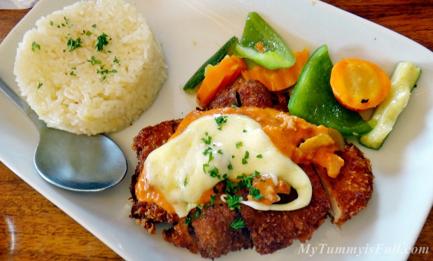 Breaded chicken meal goodness in tomato meat sauce, mozzarella cheese, served with rice pilaf and a side of roasted vegetables.