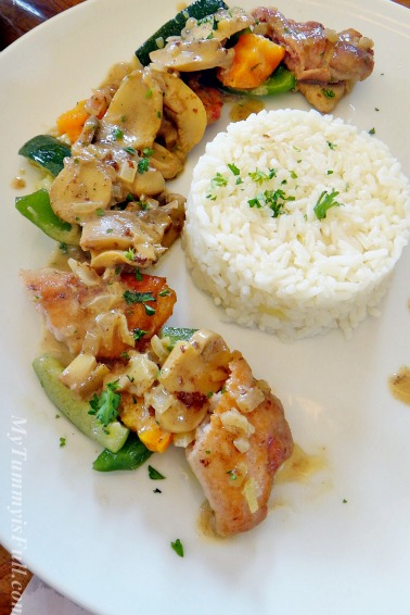 This rolled pork specialty filled with ham and cheese, button mushrooms, and cream, all reduced in marsala wine and served with rice pilaf and a side of roasted vegetables, reminds me a lot of cordon bleu, only better. I’m totally loving how the roasted veggies complement the package. 🙂