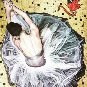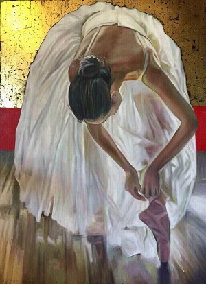 “After Rehearsals” captures a ballerina from a top shot, her body bent over, hair tightly tied in a bun, her tutu spread around her, a silk shoe showing at the edge, her hands folded at her ankles; all this amid a gold leaf background.